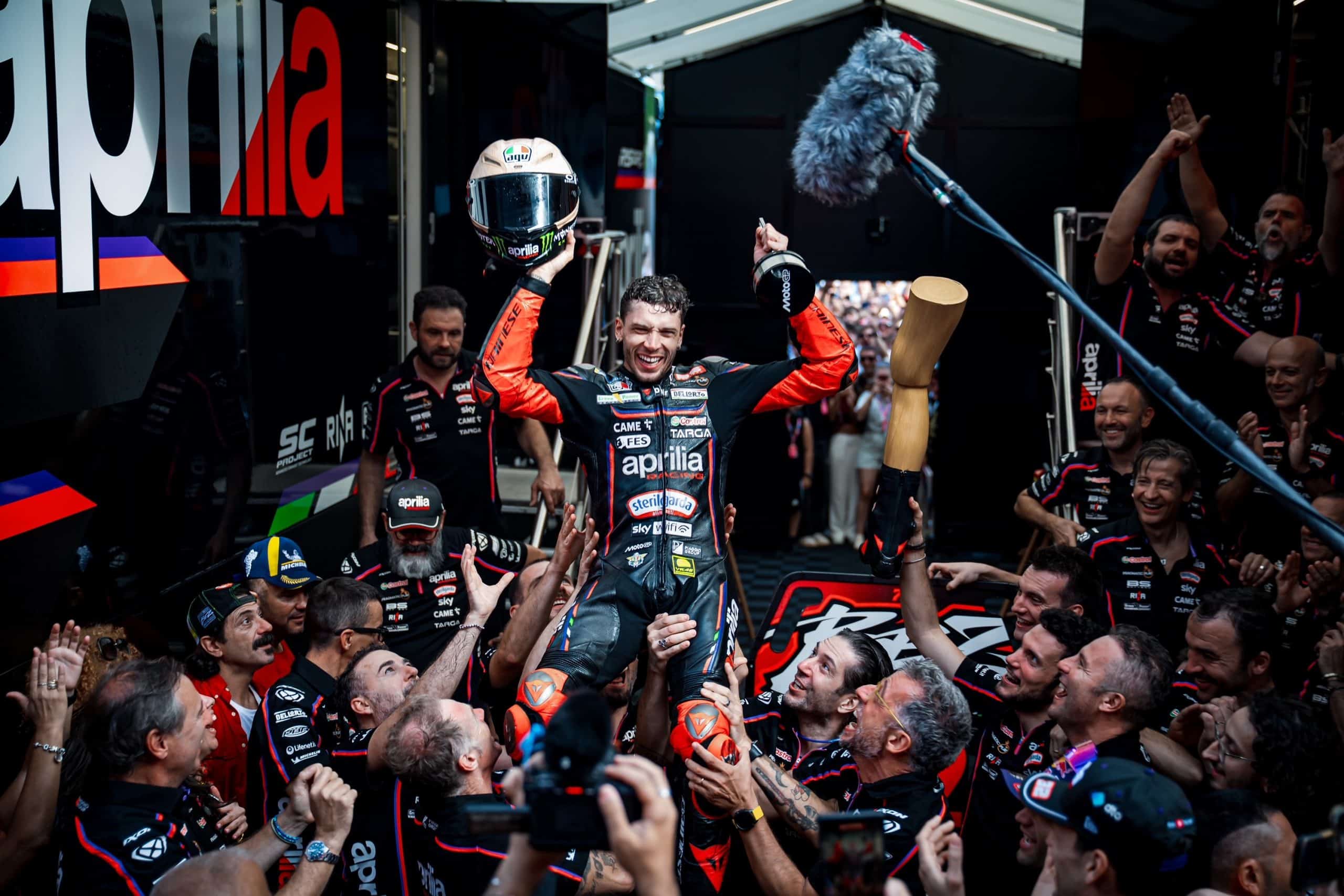 Sono passate poche ore dalla gara di Misano e ancora a fatica sto smaltendo l’adrenalina. Un week end incredibile, dove volevo rifarmi dopo le cadute a Barcellona e soprattutto dare tutto quanto nella gara di casa. Davanti ai miei tifosi. Che mi hanno incitato con un cuore pazzesco fin dalle qualifiche. Il week end parte bene, Q2 centrata e in qualifica riesco a far un gran giro. POLE! Per la sprint sono carico, parto bene, tengo la testa. Marc (Marquez) mi è dietro, prova a passarmi, resisto, mi passa in contropiede. Continuo a girar forte, non lo mollo. Anche lui è davvero al massimo e dopo poco si stende. Resto davanti, concentrato, questa SPRINT la voglio mia. Arrivo, boato dei tifosi, inizia la festa. Sipario con la gamba di legno che evoca il Garpez del fim tre uomini e una gamba di Aldo Giovanni e Giacomo a cui è ispirato il casco. Un film che ha segnato la mia infanzia e che ho voluto omaggiare nella gara di casa.